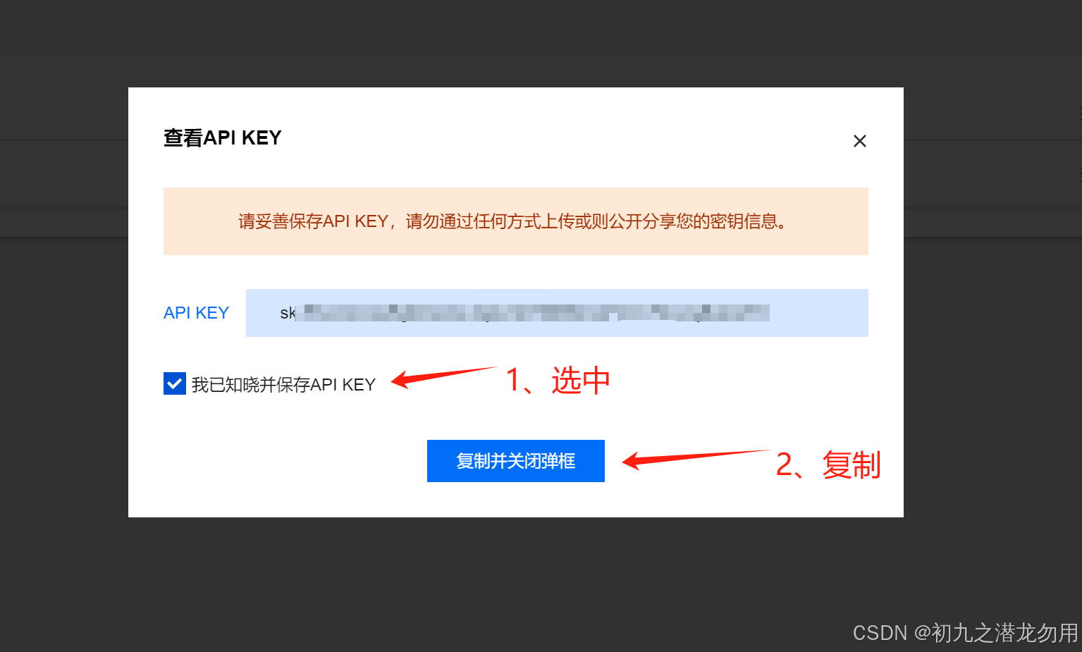 访问左侧 API keys 功能菜单,点击 “创建 API key” 按钮,按提示输入名称等点击确认即可生成 key 值,请务必妥善存储,这是调用 API 的关键认证信息值。