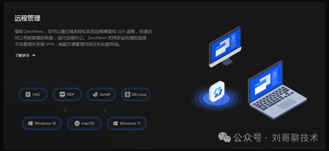 业务场景远程办公与紧急运维远程办公时,随时随地安-全访问办公室或家中的 Windows、Linux 或 macOS 物理电脑。无需配置复杂的 VPN,通过 ZeroNews 将内网设备的 RDP、SSH 或 VNC 服务映射为专属域名,即可使用个人常用环境和文件。 当线上服务在非工作时间出现故障时,运维工程师可通过手机、平板或任意外网电脑,快速、安-全地接入公司内网的服务器、数据库、监控系统或跳板机,进行故障排查与修复。