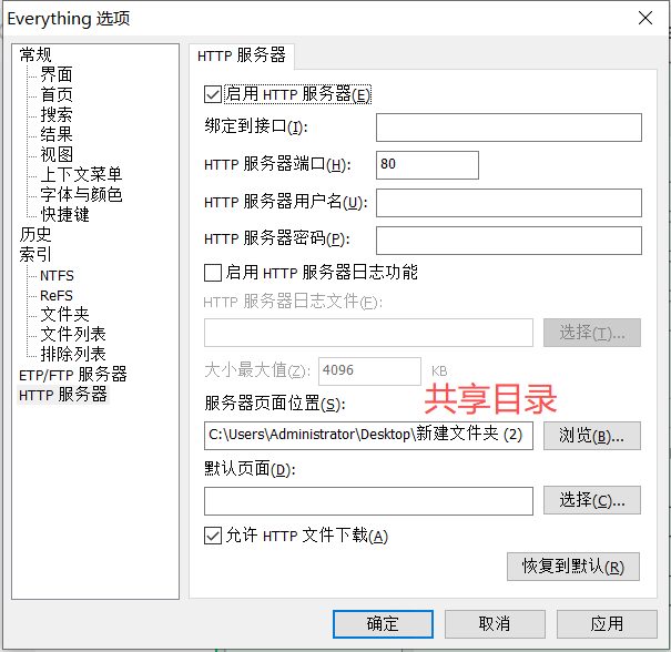 Everything 内置 ETP/FTP、HTTP 两种服务器,无需额外安装软件,即可快速实现文件共享与远程访问。下面重点介绍HTTP服务文件共享方法: HTTP 服务器让任何设备通过浏览器访问你的文件,支持文件预览,适合临时共享和跨平台访问。 配置步骤: