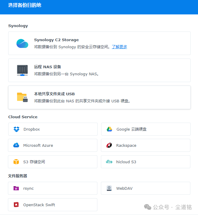重要提醒:Hyper Backup 虽支持 Synology C2 Storage,但该服务目前在大陆地区不可用,国内用户可直接忽略此选项,优先选择上述可用目的地。