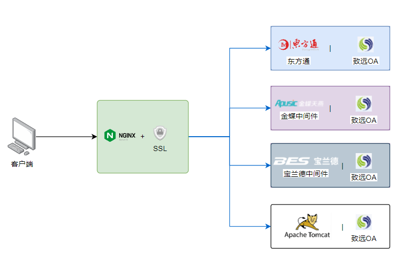 我们通过 Nginx 做反向代理,在 Nginx 里完成 SSL 证书的部署与 HTTPS 配置,只需在 Nginx 侧统一管理 HTTPS,协同 OA 以及它依赖的所有中间件(包括东方通、金蝶、宝兰德等信创中间件)都不需要做任何改动——它们依旧保持默认的HTTP模式运行,HTTPS 的全部管理工作全部由 Nginx 承担。