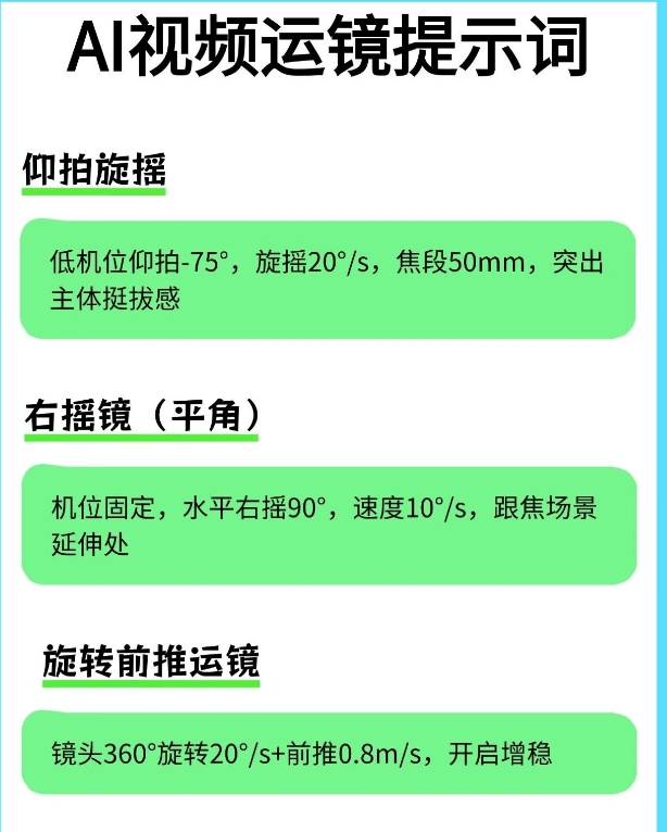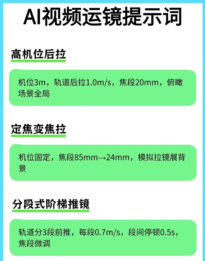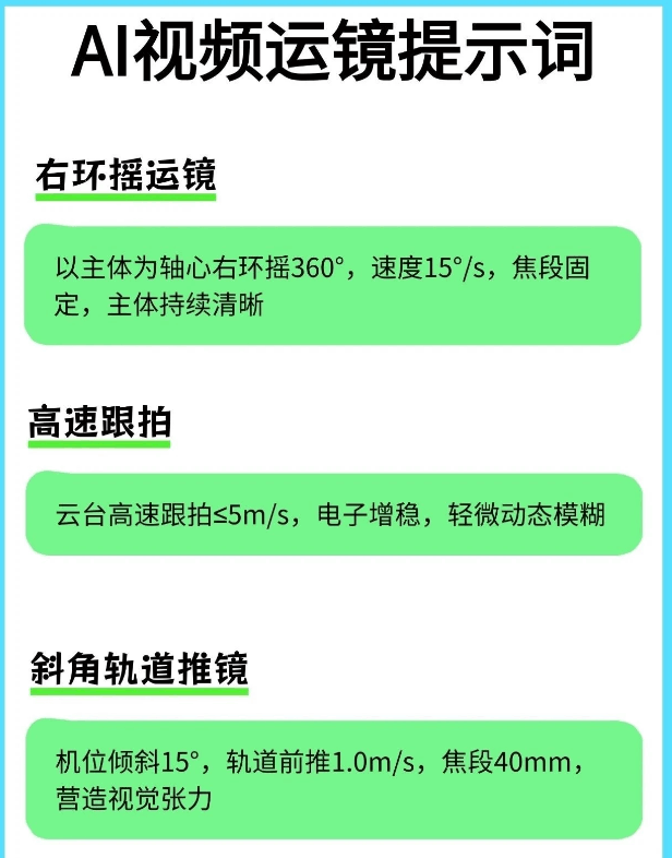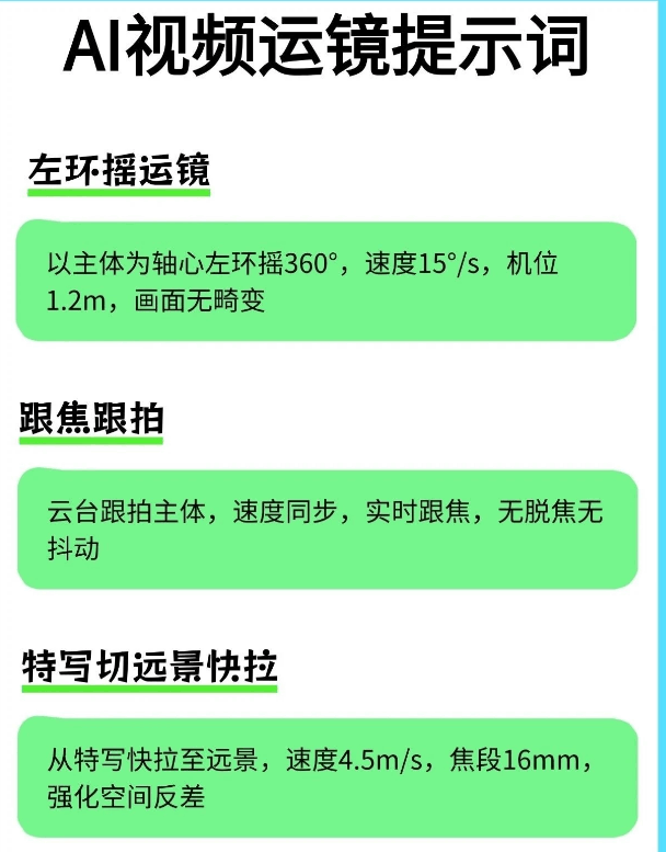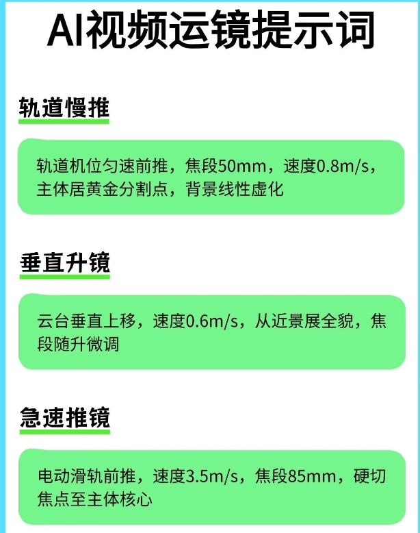 有了这个即梦4.0运镜提示词就不一样了。 它对小白特别友好,就算你完全不懂摄影,也能轻松拍出电影感✨。 不管你是用手机拍,还是用相机拍,都能用得上。像拍Vlog、人物特写啥的,它统统适配。 我试了一下,按照提示词来拍,视频的质感直接起飞了。 感觉就像是有个专业的摄影师在旁边指导我一样。 现在这种好用的提示词很难找全了,所以我强烈建议大家赶紧把这份“拍啥都像大片”的指令合集存住🔥🔥。