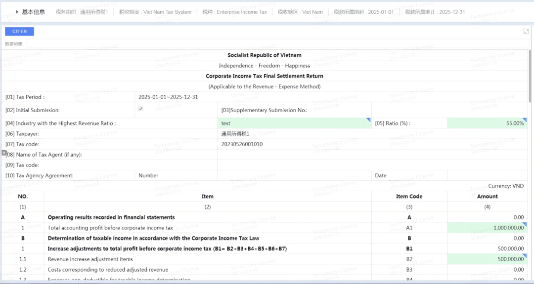 基于业财税一体化架构,计税引擎可自动提取业务数据,精准识别地址条件、税务产品、交易方资质等核心税务要素,判断税码和适用公式,从而快速准确计算税额,最终生成符合越南税务申报规范的增值税申报表。针对年度企业所得税汇算清缴,系统可自动归集涉税数据、完成合规计税,生成满足越南税务审计要求的企业所得税申报表,大幅缩减申报准备周期,助力企业高效完成税务申报,筑牢越南税务合规防线。