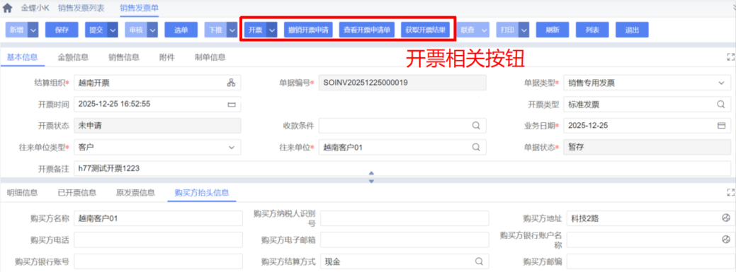 金蝶AI星空套件通过第三方发票服务商对接越南税务系统,实现发票的一键开具、自动同步与集中管理,大幅提升开票效率与合规性。企业发生销售业务后,可以从销售订单/出库单/财务应收单下推销售发票进行开票;完成开票后,可在系统中获取发票信息和发票文件,并更新到已开票信息中,实现业务流与发票流的无缝衔接。这种业票联动的模式,不仅减少人工录入误差,更强化企业内控管理,从源头规避发票开具不合规引发的税务风险。