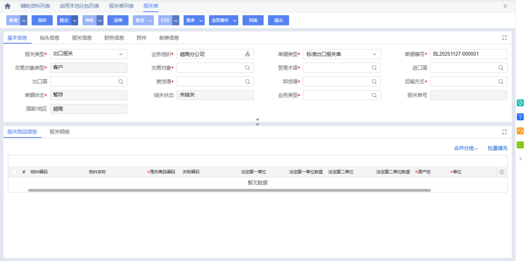 金蝶AI星空套件深度集成越南当地海关服务商,实现全流程的进出口报关及监管申报,确保报关信息准确透明、流程高效合规。一方面,在进出口环节,系统将采购销售相关单据自动转换为报关单,由海关ISV完善报关信息后提报海关,省去人工制单、改单的繁琐流程;另一方面,系统整合采购、生产、库存及销售管理等全链路数据,生成符合越南海关标准格式的实际生产定额表、原材料和产品结算报告,并一键推送至海关服务商系统,大幅提升年度申报与周期性自查的效率。