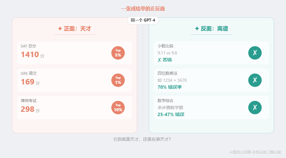 给一些参照系。SAT 满分 1600 分,美国高中生平均约 1050 分,GPT-4 考了 1410——全国前 5%。GRE 语文 169 分,超过了 99% 的考生——而这些考生本身已经是大学毕业生。 如果这是一个人类考生,你会说:天才。 现在翻面。 同一个 GPT-4: