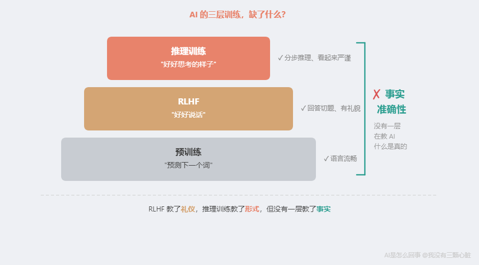 原因分析:为了"好好推理"而优化的模型,倾向于用看似合理的推测来填补知识空白——推理链越长,编造看起来越"有道理"。 RLHF 教会了 AI "好好说话"。推理训练教会了 AI "好好思考的样子"。但两者都没有教会 AI 什么是"事实"。