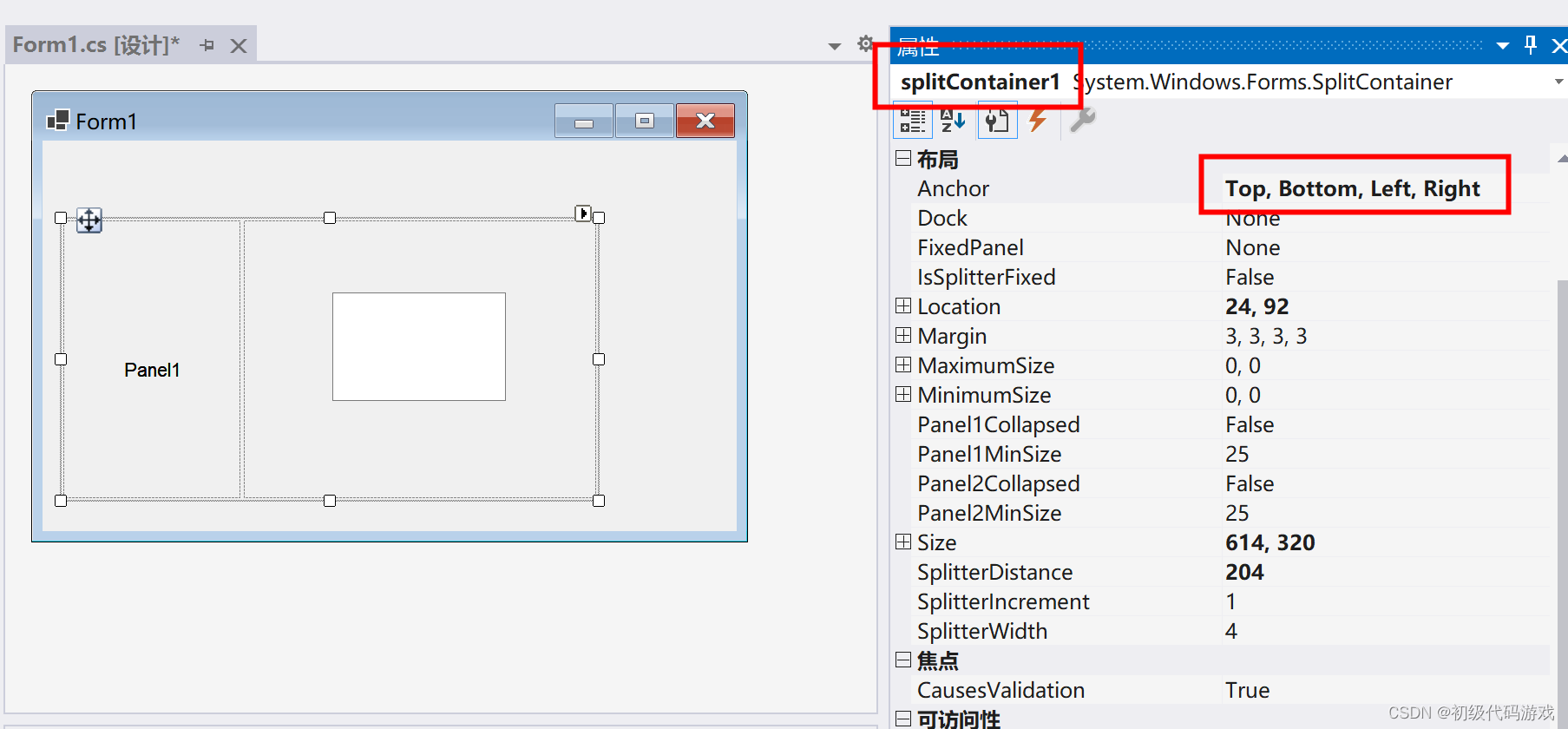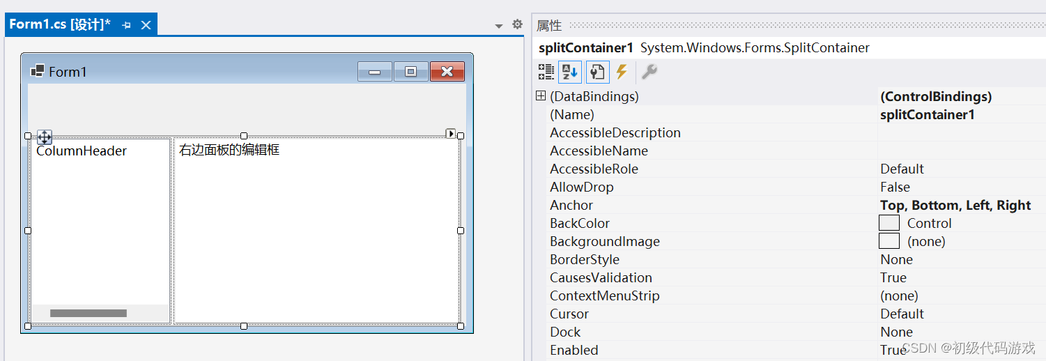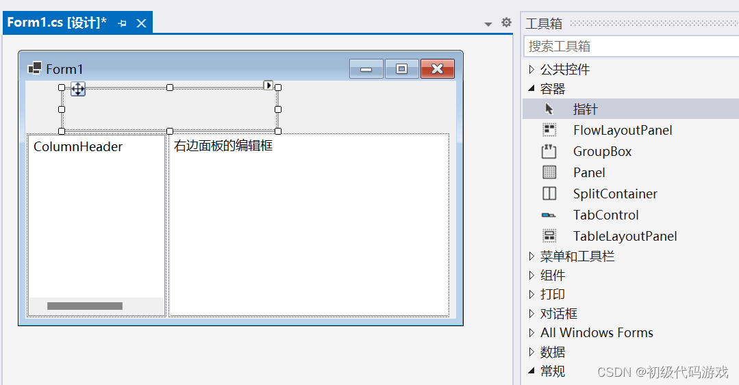 将容器控件拉大一些,可以用鼠标拖动中间的分隔条改变比例,如果不小心点到了子空间里面,就在属性窗口重新选择容器。