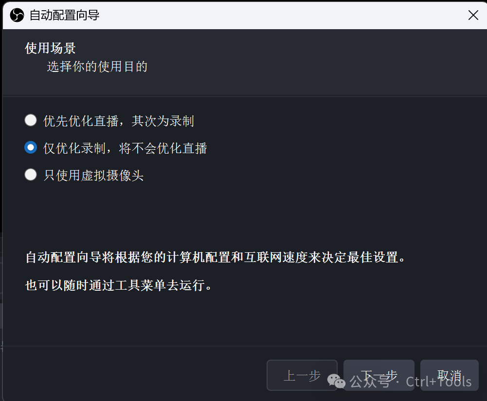 没想好可以点取消,可以随时通过菜单中的“工具”->“自动配置向导”打开。(因为本篇先介绍录制功能,下面是优先录制设置)