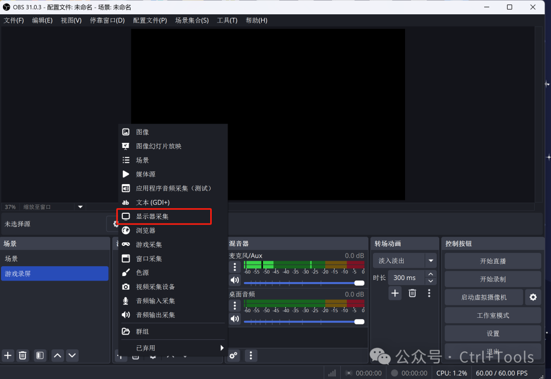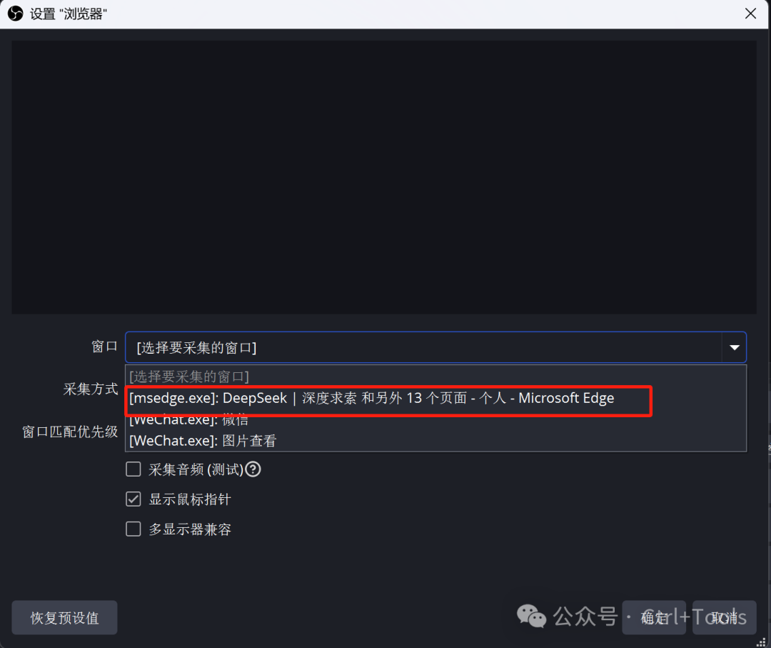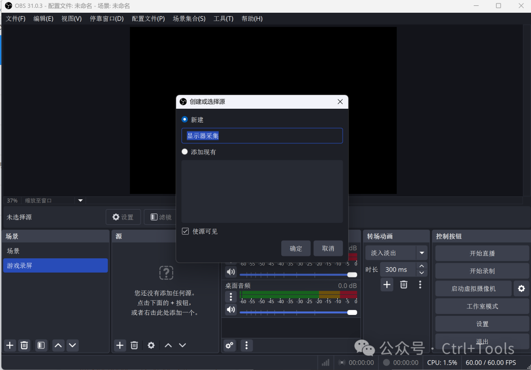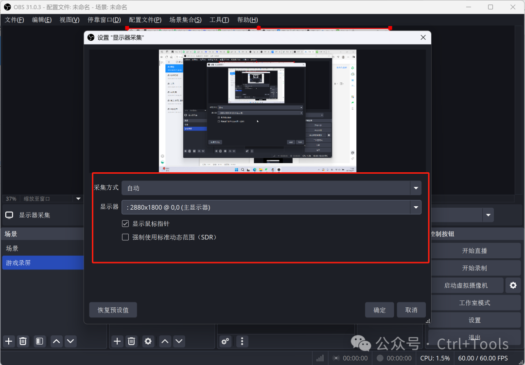 全屏录制新建源选择“显示器采集”,显示器选择录制的显示器