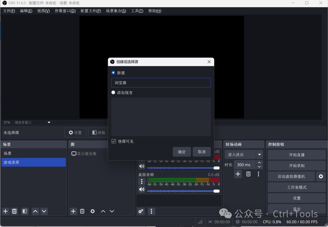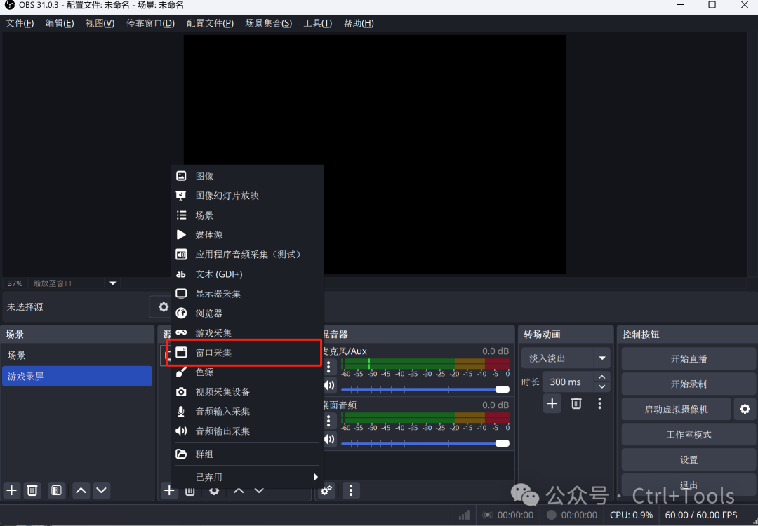 1.同样新建录屏场景后,新建源,本次源选择“窗口采集”