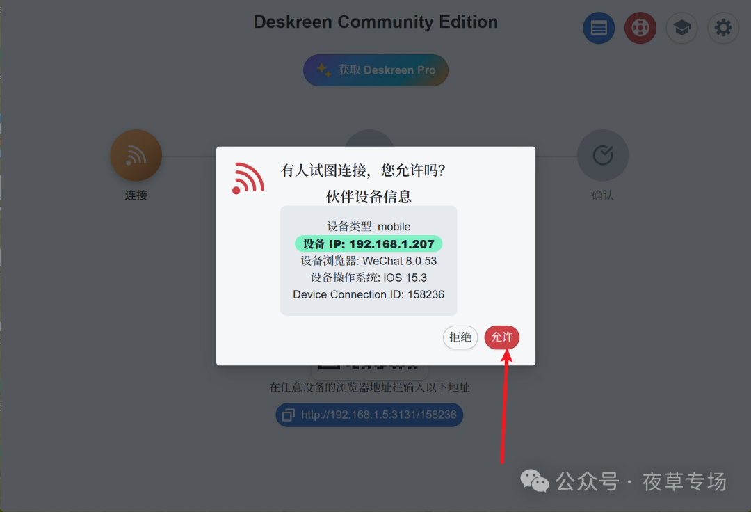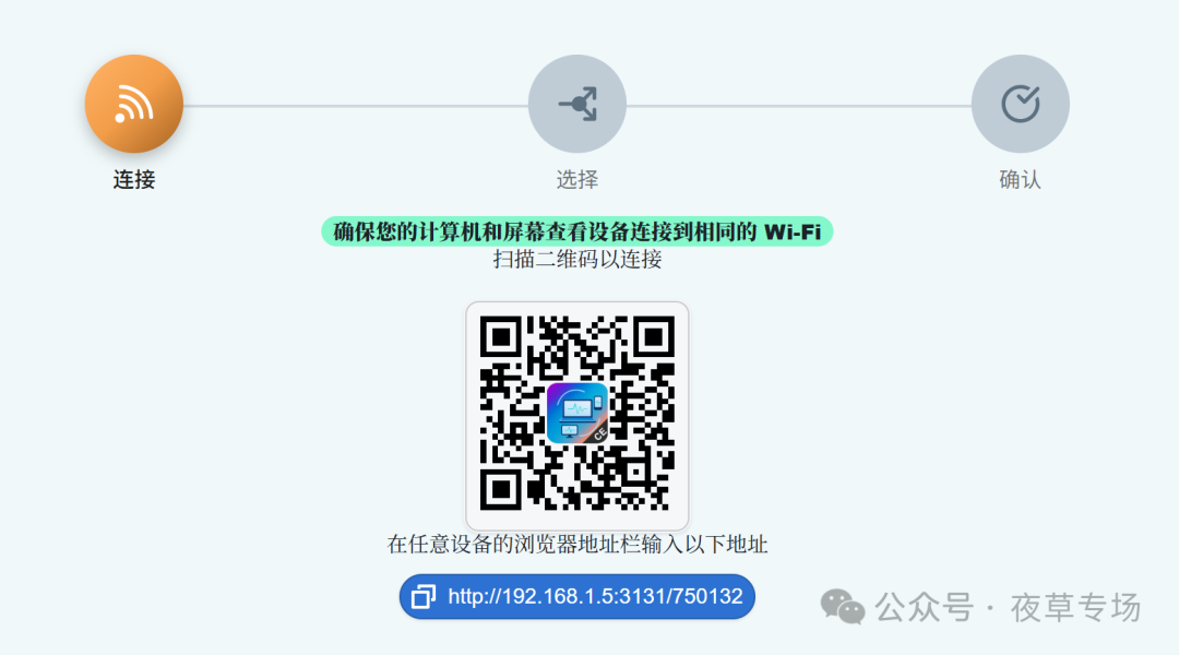 多设备同时投屏的功能让Deskreen的应用场景更加广泛。无论是开会、授课还是个人工作,多显示器带来的高效体验都让人难以忘怀。当您需要一边查询文档一边写代码时,只需简单几步,即可将电脑屏幕内容投屏到平板上,实现无缝切换,如下图分享链接,可扫码直接获取地址,也可以手动输入IP地址。