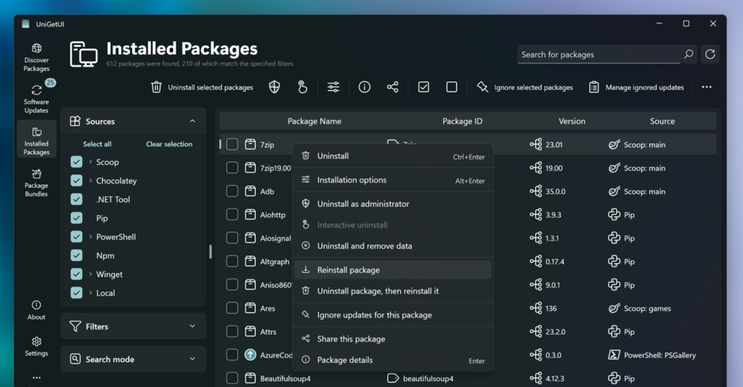 它更像是一个专为开发者设计的应用商店,已在 GitHub 斩获 21000+ Star,而且一直持续活跃更新。 简单说,UniGetUI 就是把 WinGet、Scoop、Chocolatey、pip、npm、.NET Tool、PowerShell Gallery 这些包管理器,全都塞进了同一个图形界面里。 而原本那些要在七八个黑框里敲的命令,现在鼠标点点就行了。