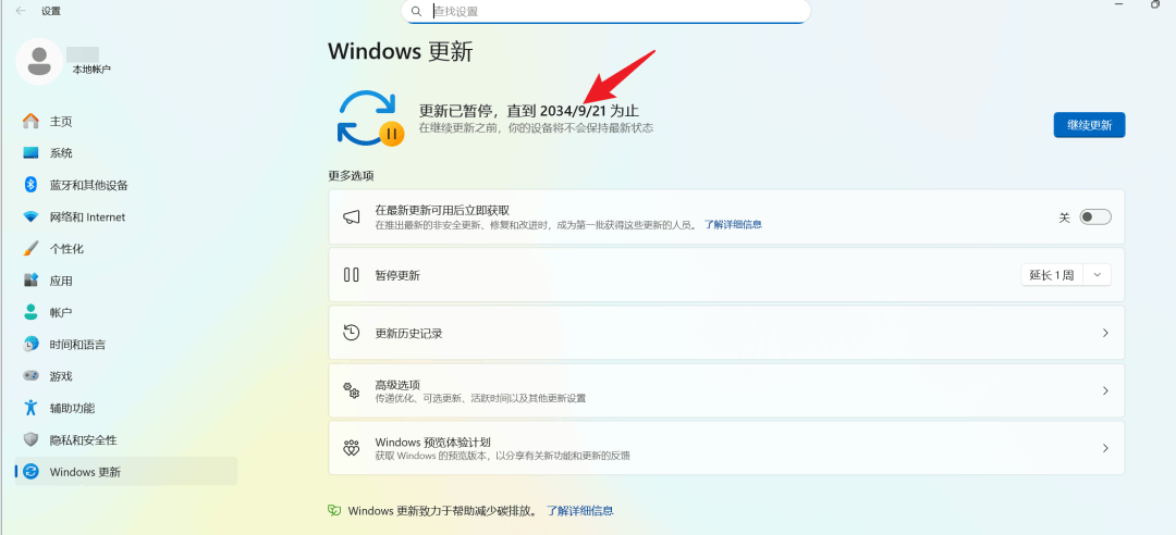 当运用软件的暂停更新功能后,在暂停更新的设置选项里,最高能够暂停2925周,算下来大约是56年,这几乎等同于永久性暂停更新了。