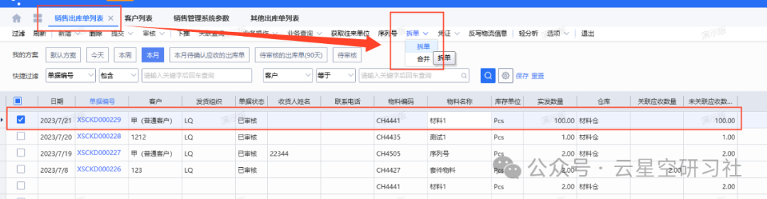 这时候,一张销售出库单对应多张发票,财务和业务都对不上,对账时头疼不已。图1图2系统会自动生成一张“原单号+001”的子单。如图3:图3之后,不同的子单分别下推应收单,结算、开票就能一一对应了。如果后期客户又说不分开了,也没关系——选中带后缀的子单,点击“合并”,就能回到合并状态,如图4:图4