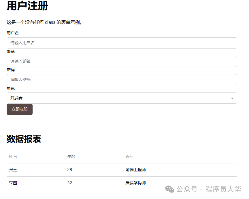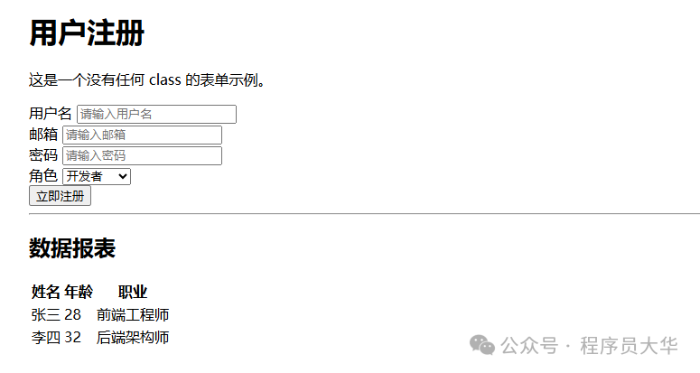 <p>这是一个没有任何 class 的表单示例。</p>