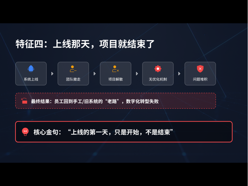 特征三:高层不参与,IT部门在扛![]() 特征四:系统上线那天,项目就结束了上线后,实施团队撤走,内部项目组解散,没有持续优化机制;3个月后,问题堆积,员工回到老路。