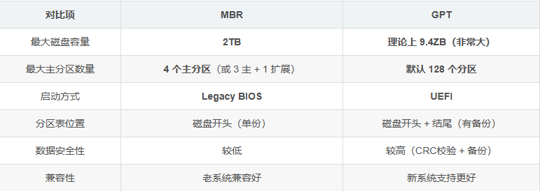 磁盘分区表常见有两种格式:MBR(Master Boot Record) 和 GPT(GUID Partition Table)。它们主要在 容量支持、分区数量、启动方式、可靠性 等方面有明显区别。