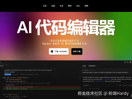 前端最耗时:写页面、调样式、做响应式、加交互。 Cursor(AI 原生编辑器) 是前端 UI 生成神器,比 VS Code 更智能,支持跨文件、自动处理样式依赖。