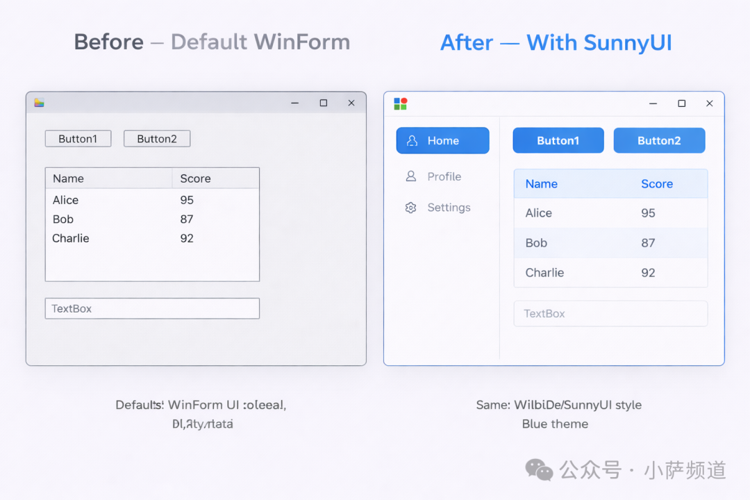 这个印象不能说全错。WinForm 确实老了,默认的那些控件灰扑扑的圆角按钮、丑到离谱的 DataGridView、动不动就糊成一团的 DPI 问题——做企业管理系统够用,拿来做稍微有点要求的界面,心里总有点不体面。 但 WinForm 有一个巨大的优势被低估了:它依然是 .NET 里操控桌面最直接、最底层的方式。不需要 XAML,不需要编译,不需要了解 WPF 那套渲染树——你要什么,代码就画什么。 问题不是 WinForm 本身不行,是默认的 UI 太丑了。 而 SunnyUI 做的事情,就是让 WinForm 彻底告别那个"土"字。