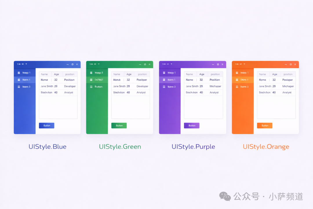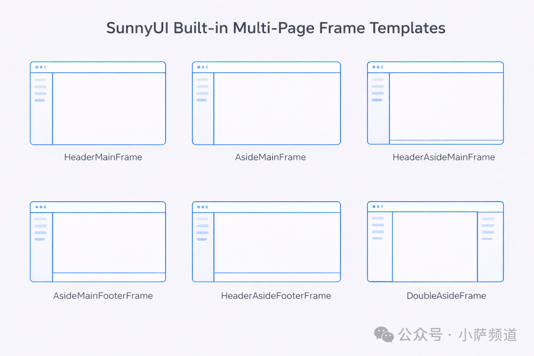 这些控件如果自己从头写,耗进去的时间不是一两天。 第二,17 套主题,一键切换。 SunnyUI 内置了 17 套主题风格,包括蓝色、绿色、红色、紫色等常见配色,以及一套从 Element UI 借鉴而来的设计语言(所以叫 SunnyUI)。用起来只需要一行代码: 对于需要换肤能力的桌面应用,这个功能是实打实的工程节省。 第三,多页面框架,7 套模板。 这是 SunnyUI 最被低估的功能。它内置了 7 种多页面应用框架模板,参考了 Element UI 的页面组织方式,主frame + aside 导航 + 内容区,配合 做企业管理软件、数据监控系统,这种"主界面 + 多页面"的架构是最常见的。用 SunnyUI 的框架模板,搭一个这样的系统比你想象中快很多。