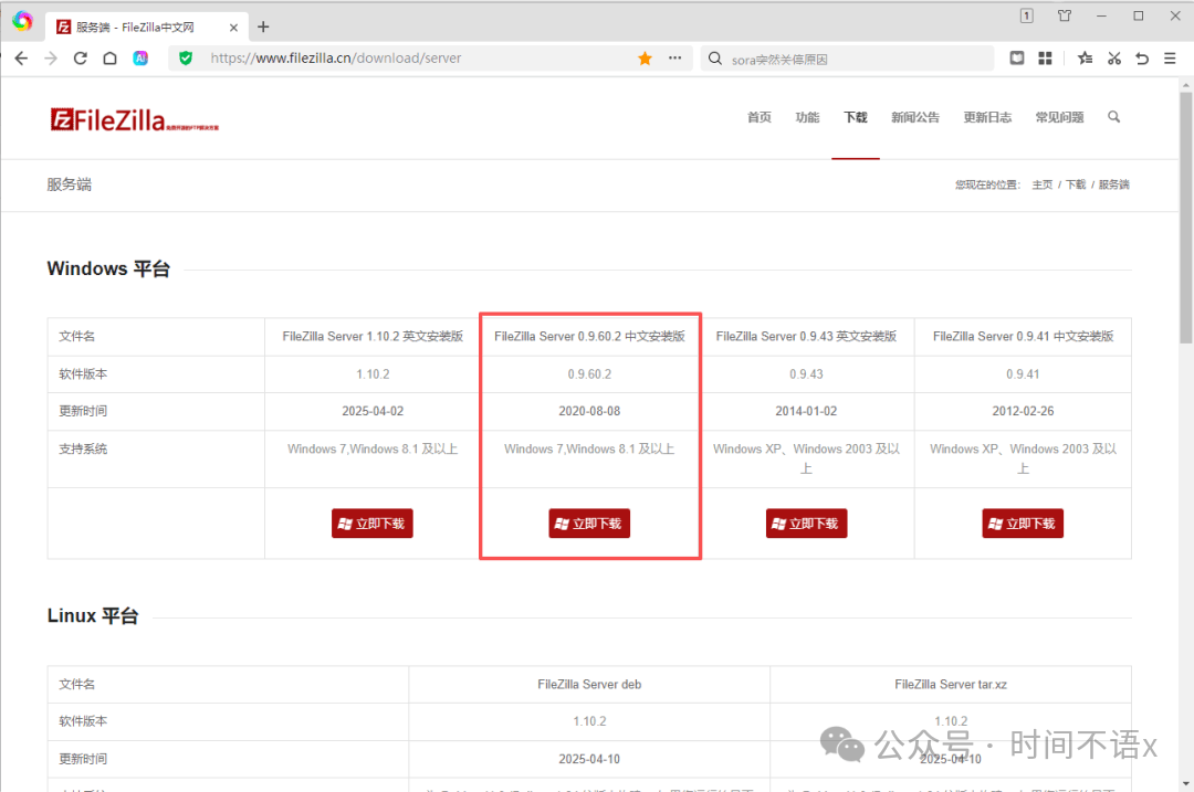 3. 选择Windows平台版本,点击“Filezilla中文安装板”进行下载即可(也可选择中文版)。