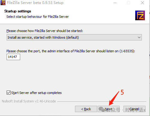 4. 选择Filezilla Server服务启动方式和端口号,然后点击下一步。