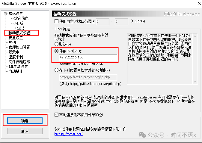 2. 如发现提示如下错误,可手动修改服务器IP地址解决,依次点击“编辑”,打开设置界面,选择被动模式设置,勾选“使用下列IP”,并填写服务器的IP地址,之后点击“OK”保存。