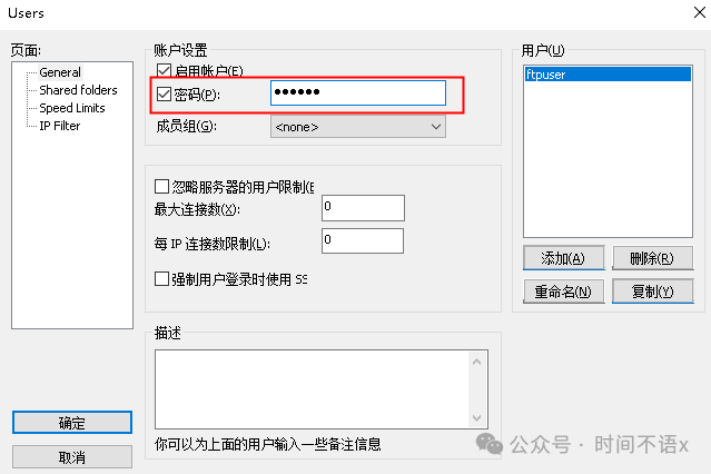 • 用户名:搭建 FTP 服务 时设置的 FTP 用户的帐号。图中以 “ftpuser1” 为例。
