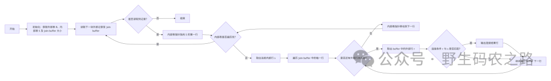 • • Block Nested-Loop Join:把驱动表批量加载到 JOIN Buffer 里再匹配(流程如下图),但还是 O (m * n) 的复杂度,没索引的大表关联时慢到离谱。