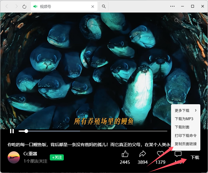 加载后,在微信视频号页面上右下角会出现“下载”,点击可以直接下载,鼠标光标放上去,会看到更多操作信息。