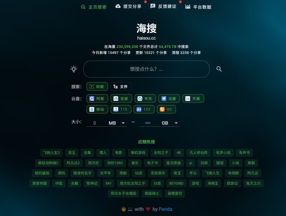 [点晴永久免费OA]海搜,在线多网盘资源聚合搜索引擎,支持阿里云盘、百度网盘、迅雷、天翼、夸克、UC等9个网站