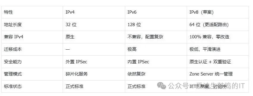 2026 年 4 月,IETF(国际互联网工程任务组)发布了draft-thain-ipv8-01全新草案,一份面向未来的网络层协议 ——IPv8正式进入公众视野。 ![]() 它不追求推翻重来,也不是 IPv6 的替代品,而是瞄准当下最痛的地址枯竭、迁移成本高、运维复杂、安全薄弱四大难题,给出一套可落地、低成本、兼容现有网络的务实方案。对于网络工程师、运维人员、企业 IT 决策者来说,这是未来 3–5 年必须提前看懂的技术方向。 一、IPv8 到底是什么?一句话讲清 IPv8 是 IETF 最新提出的新一代网络层协议套件,定位是:IPv4 的平滑接班人、现有网络的低成本升级方案。 它最大的亮点不是性能多强,而是100% 兼容 IPv4、可与 IPv6 互补共存,现有路由器、交换机几乎不用改造就能用,彻底解决 IPv6 推广多年 “难落地、成本高” 的行业痛点。 简单说: IPv4:老房子,地址不够用 IPv6:新建大楼,迁移太贵 IPv8:在老房子基础上直接加层扩建,不用搬家、不用砸墙,直接住 ![]() 二、IPv8 核心技术:小白也能看懂的关键亮点 1. 地址设计:64 位,刚好够用、更好路由 IPv8 采用64 位地址,格式:r.r.r.r.n.n.n.n 前 32 位:路由前缀(ASN),负责路由转发,抑制路由表膨胀 后 32 位:主机地址,和 IPv4 完全一样,学习成本极低 总地址量:2⁶⁴ ≈ 1844 亿亿个,车联网、物联网、工业设备随便用 最关键:当 r=[0.0.0.0](0.0.0.0) 时,IPv8 自动降级为纯 IPv4现有设备不用改配置、不用换硬件,直接兼容。 2. 兼容能力:三栈共存,零改造迁移 对 IPv4:无缝互通,设备零改造、策略零调整 对 IPv6:支持 8to4 隧道,可构建 IPv4/IPv6/IPv8 三栈网络 配套 XLATE8 转换器:IPv4 与 IPv8 数据包头自动转换,业务无感知 企业不用一次性大刀阔斧升级,可以慢慢迭代、逐步上线。 3. 架构革新:Zone Server 统一中枢,运维大减负 传统网络:DHCP、DNS、NTP、WHOIS、日志监控… 一堆系统各自为政,又乱又累。 IPv8 直接用Zone Server 区域服务器整合一切: DHCP8 地址分配 DNS8 域名解析 NTP8 时间同步 WHOIS8 路由验证 NetLog8 网络遥测 一台平台管全网,减少碎片化、降低故障点、节省人力。 路由协议也同步升级: 4. 原生安全:自带零信任,防攻击更省心 IPv8 把安全直接写进协议: 内置 OAuth2 + JWT 身份认证,未授权无法通信 出口数据包:DNS8 + WHOIS8 双重验证 成本因子 CF 路由算法:识别超光速异常传输,防 DDoS、路由欺诈、僵尸网络 不用额外堆安全设备,网络天生更安全。 三、IPv4 / IPv6 / IPv8 一张表看懂差距 四、必须澄清的 4 个误区(别被带偏) IPv8 不是 IPv6 的升级版两者并行、互补,不是替代关系。 IPv8 不是民间 / 区块链项目这是 IETF 官方草案,和开源 py-ipv8(P2P 覆盖网)完全无关。 IPv8 不是第 8 层协议它和 IPv4/IPv6 一样,属于网络层(第 3 层)。 现在还不能直接商用部署目前是公开讨论阶段(有效期至 2026-10-17),属于技术前瞻、提前布局。 五、对网络从业者意味着什么? 企业 IT:未来升级不用再纠结 “换设备还是凑合用”,IPv8 提供低成本路径 运维工程师:运维模式简化,一台平台管全网,效率大幅提升 路由工程师:BGP8、OSPF8、64 位地址将成为新技能点 行业方向:从 “堆硬件、强改造” 转向兼容、平滑、轻量化升级 结语 IPv8 的出现,不是为了制造技术焦虑,而是给行业一个更务实、更便宜、更好用的未来网络方案。 虽然还在草案阶段,但它已经清晰指明:下一代互联网,不一定是推倒重来,而是平滑演进。 建议网络工程、运维、IT 管理者提前收藏学习,抓住下一波技术红利。 #IPv8 #网络协议 #路由交换 #IETF #IT 技术前瞻 阅读原文:原文链接 该文章在 2026/4/20 9:37:03 编辑过 |