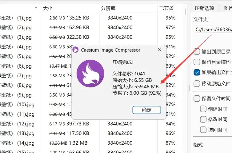 1000张6.5GB大小的图片压缩完成也只用了不到1分钟时间,压缩比率达到了92%,之前的6.5GB文件直接压缩成了559MB,节省了6GB的磁盘空间,这个压缩效果已经相当不错了。