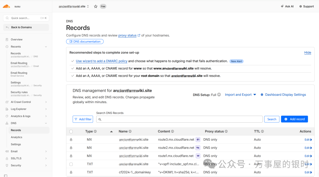 首次进入点「开始使用」,Cloudflare 会引导你完成配置,自动添加必要的 MX 和 TXT 记录,不需要手动操作 DNS。