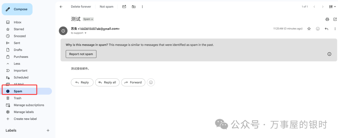 用另一个邮箱(比如朋友的邮箱或者自己的第二个邮箱)发一封邮件到 hello@你的域名.com,看看是否在你的 Gmail 里收到(在垃圾邮箱里面查看)。