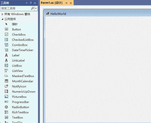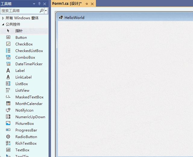 2. 双击控件添加:在工具箱中,选择需要添加的控件,然后双击鼠标,即可添加控件到Form窗体的上上角位置,并呈现选中状态,可以手动拖动控件到目标位置,如下所示: