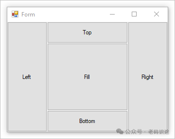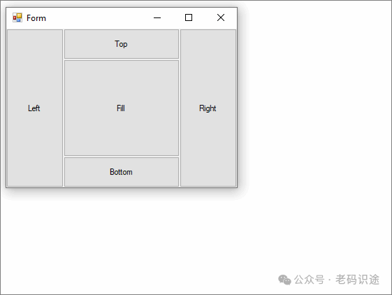 停靠(Dock),属性可设置控件的哪个边与父级的对应边对齐,以及如何在父级中调整控件的大小。Dock属性要一个枚举类型,它有5个值,设置后效果如下: