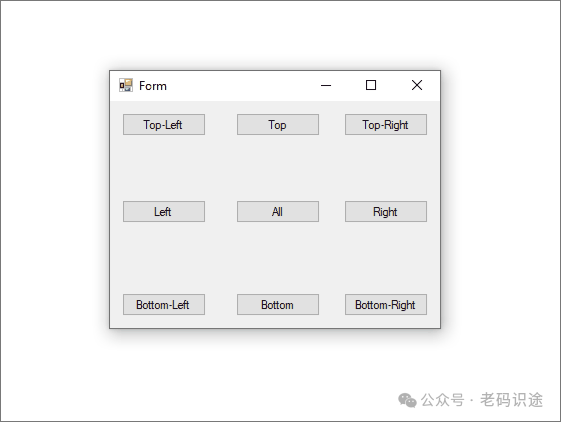 锚点(Anchor),通过定位控件,可将控件绑定到父级容器的一侧或多侧。 随着容器大小的变化,锚定子控件保持与定位端的距离。控件可以定位到一侧或多侧,不存在限制。 定位点由 Anchor 属性设置。