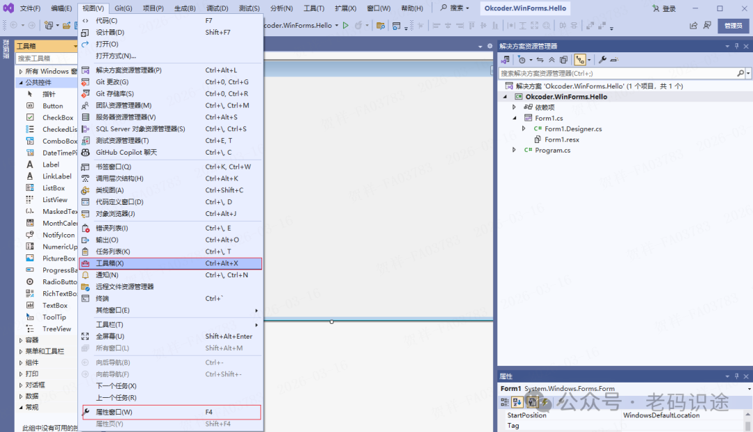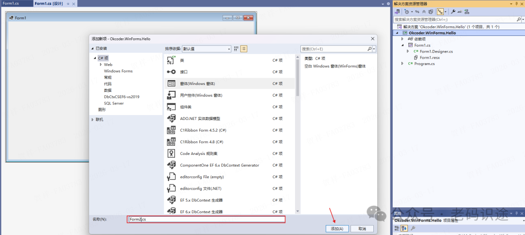 ![]() 默认情况下,Visual Studio不会打开工具箱和属性窗口。 Visual Studio会记住您打开这些窗口的操作,并在以后保持打开。可以通过点击菜单栏“视图(V)”,然后“工具箱(X)”打开工具箱窗口,及“属性窗口(W)”菜单,打开属性窗口。 ![]() Form窗体首先在需要添加新窗体的项目上右键,在弹出的快捷菜单中选择“添加(D)”然后在弹出的子菜单中选择“窗体(Windows窗体)(F)...”,然后打开添加窗体对话框。 ![]() 在打开的添加新项对话框中,会默认选择“窗体(Windows窗体)”模板,然后输入窗体"名称(N)",如“Form2”,点击“添加(A)”即可。 ![]() 创建成功后,Form窗体文件主要包含3部分,如下所示: