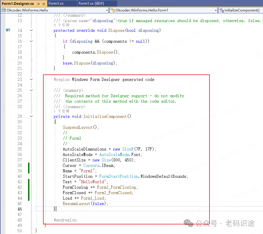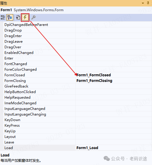 在Visual Studio设计器,选择Form窗体,在右下角的属性窗口中,可以直接设置对应的属性,如下所示: ![]() 事件也可以在属性窗口切换事件Tab页后进行双击设置。如下所示: ![]() 当通过属性窗口中设置相应的属性和事件后,会在窗体对应的Designer.cs类文件中自动生成相关代码,如下所示: ![]() 并且在表单对应的.cs文件中生成对应的事件委托方法体,可以在其中编写业务逻辑,如下所示: ![]() 运行调试
