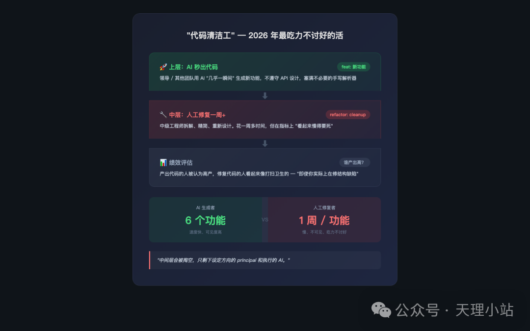 最后那个人的自述特别诚实:"我一开始只在讨厌的事情上用 AI,后来到处都用。速度确实快了 5 倍。大部分时候我能跟上。每周两次我意识到自己完全不知道代码在干嘛。每月一次它让我倒退一周以上。" 而那个 3 人 10 万 DAU 的案例特别值得细看。这个团队不是在"vibe coding"——3 个人里 2 个完全理解代码库,产品人员可以直接从 Slack 提交配置修改的 PR。过去同样的事至少要 10 个工程师。 但马上有人泼了冷水:"10 万 DAU——你们的竞争对手 1-2 个人抄一份,卖你十分之一的价,6-9 个月你就没了。" 这个分裂不是偶然。AI 擅长绿地开发,不擅长维护已有系统。 项目越新、架构越简单、约束越少,AI 越猛。代码库越老、历史包袱越重,AI 的幻觉造成的破坏越大。 三、"代码清洁工"——2026 年最惨的岗位455 条评论里点赞最高的主题之一。一位中级工程师的讲述让人心凉: