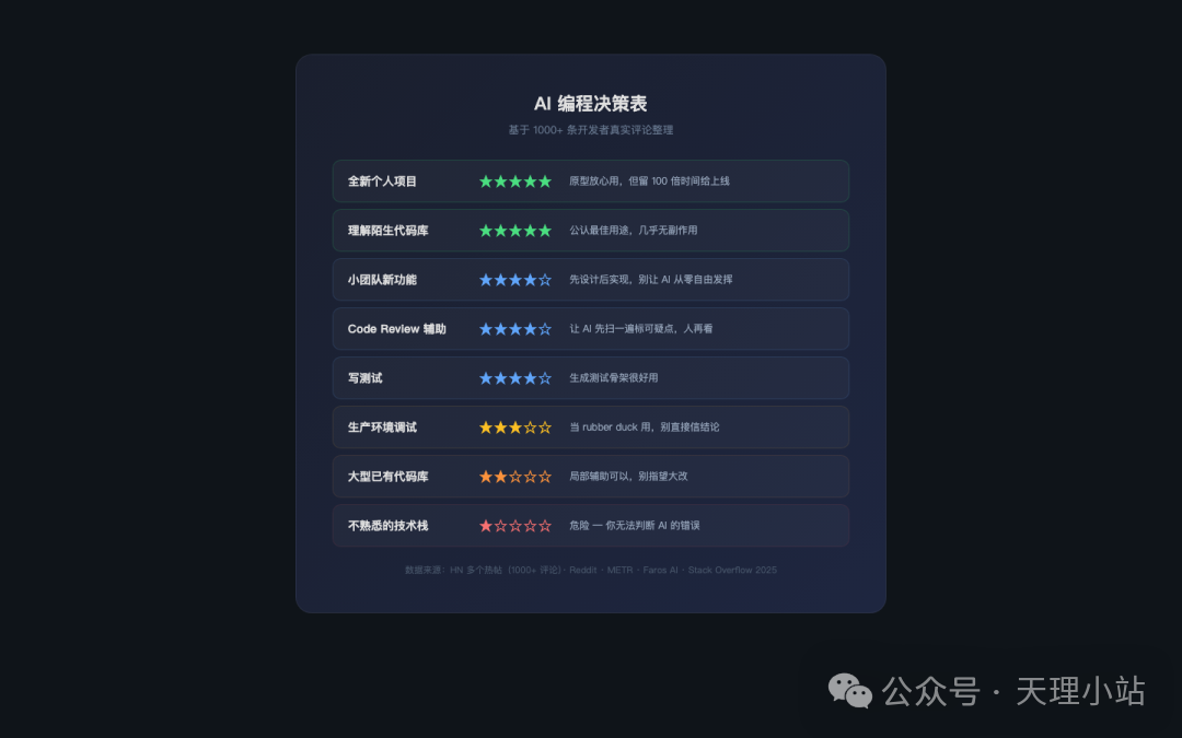 100 小时那个帖子里也有人总结:"他停止用 prompt 直接写代码、打开 Figma 开始真正设计的那一刻,Claude 的实现质量飞跃了。瓶颈从来不是代码生成,是在生成之前就该发生的思考。" HN 上另一个很好的做法来自 citizenkeen:"我们团队都用 Claude,但我有一条严格规定:我们不说'我问了 Claude'。用可以,但你必须为产出负责。" 高效使用 AI 编程的人有一个共同点:他们把 80% 的时间花在 AI 动手之前。 七、你以为你更快了,其实更慢了METR 做过一个随机对照实验:让有经验的开发者分两组,一组用顶级 AI 编程工具,一组不用。 结果:用 AI 的那组反而慢了 19%。 更扎心的:同一批人自我评估觉得自己快了 20%。 所有人的直觉偏了 40 个百分点。 Stack Overflow 2025 年调查也印证了这一点:超过 70% 的开发者在用 AI 工具,但只有不到 30% 觉得它在生产代码上持续有用。66% 的人经历了"生产力税"——AI 省下的时间,被审查和修正吃回去了。 Faros AI 追踪 10,000 名开发者给出了更精确的数字:用 AI 的团队代码产量增加 98%——但代码审查时间也增加了 91%。最终实际多完成的有效工作?只有 21%。