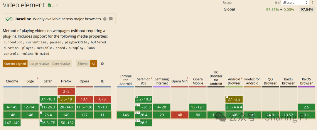 建议访问Can I Use 网站,以及时了解 video 元素在各类浏览器中的最新兼容性支持情况。下图数据截至 2026.04.11。