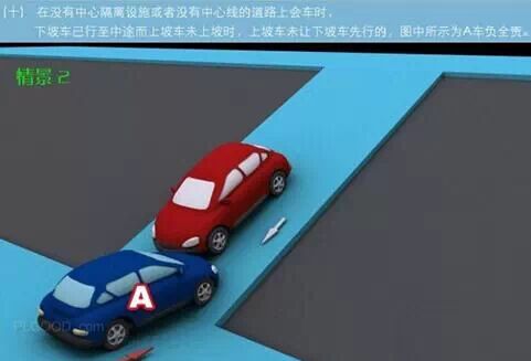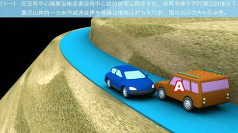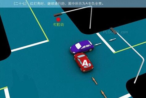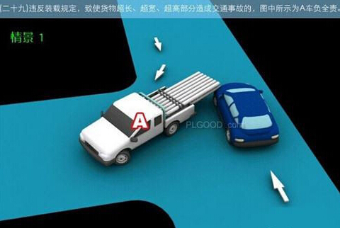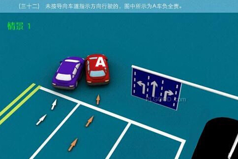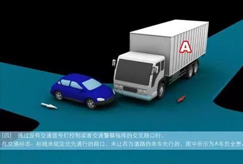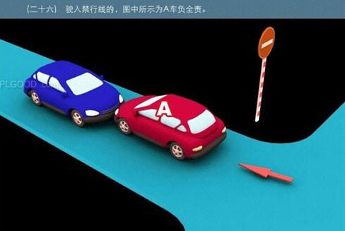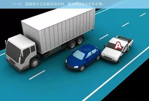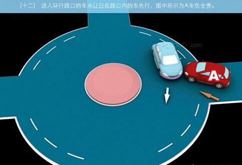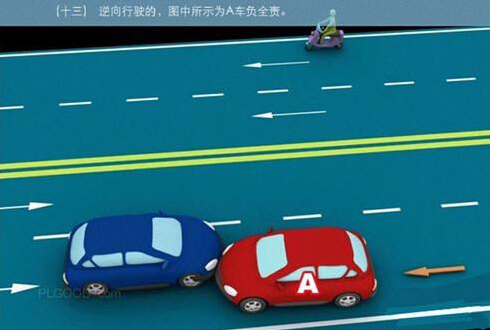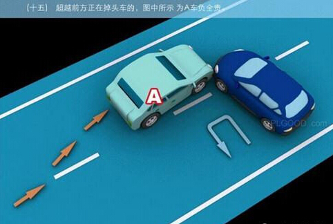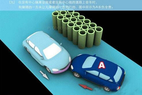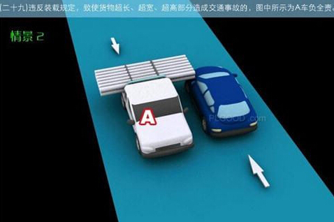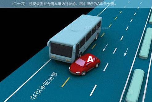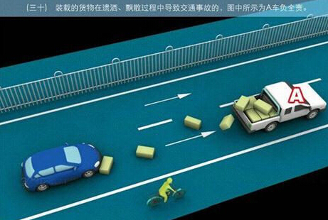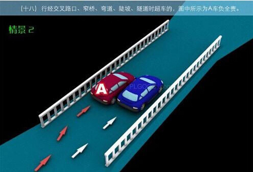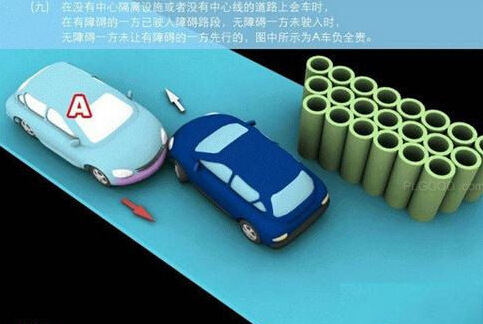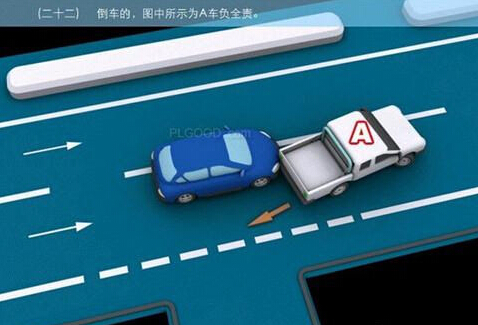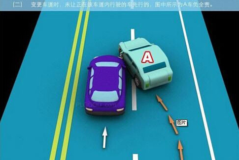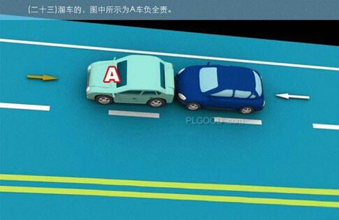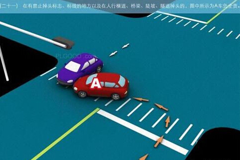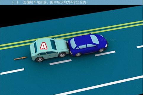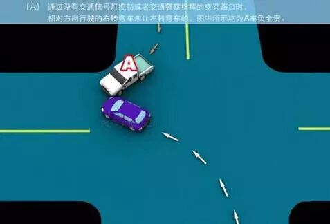 1、追撞前车尾部的,图中所示均为A车负全责。 2、变更车道时,未让正在该车道内行驶的车先行的,图中所示为A车负全责。 3. 通过没有交通信号灯控制或者交通警察指挥的交叉路口时,未让交通标志、交通标线规定优先通行的一方先行的,图中所示为A车负全责。 4、通过没有交通信号灯控制或者交通警察指挥的交叉路口时,在交通标志标线规定优先通行的路口,未让右方道路的来车先行的,图中所示为A车负全责。 5、通过没有交通信号灯控制或者交通警察指挥的交叉路口时,遇相对方向来车,左转弯车未让直行车先行的,图中所示为A车负全责。 6、通过没有交通信号灯控制或者交通警察指挥的交叉路口时,相对方向行驶的右转弯车未让左转弯车的,图中所示为A车负全责。 7、绿灯亮时,转弯车未让被放行的直行车先行的,图中所示为A车负全责。 8、红灯亮时,右转弯车未让被放行的车先行的,图中所示为A车负全责。 9、在没有中心隔离设施或者没有中心线的道路上会车时,有障碍的一方未让无障碍的一方先行的,图中所示为A车负全责。 9-2、在没有中心隔离设施或者没有中心线的道路上会车时,在有障碍的一方已驶入障碍路段,无障碍一方未驶入时无障碍一方未让有障碍一方先行的,图中所示为A车负全责。 10、在没有中心隔离设施或者没有中心线的道路上会车时,下坡车已行至中途而上坡车未上坡时,上坡车未让下坡车先行的,图中所示为A车负全责。 11、在没有中心隔离设施或者没有中心线的狭窄山路会车时,在两车难于同时通过的情况下,靠近山体的一方未作减速或停车等避让措施让对方先行的,图中所示为A车负全责。 12、进入环形路口的车未让已在路口内的车先行,图中所示为A车负全责。 13、逆向行驶的,图中所示为A车负全责。 14,超越前方正在左转弯车的,图中所示为A车负全责。 15.超越前方正在掉头车的,图中所示为A车负全责。 16、超越前方正在超车的车的,图中所示为A车负全责。 17、与对面来车有会车可能时超车的,图中所示为A车负全责。 18、行径交叉路口、窄桥、弯道、陡坡、隧道时超车的,图中所示为A车负全责。 18-2、行径交叉路口、窄桥、弯道、陡坡、隧道时超车的,图中所示为A车负全责。 19、在没有中心线或者同一方向只有一条机动车道的道路上,从前车右侧超越的,图中所示为A车负全责。 20、在没有禁止掉头标志、标线的地方掉头时,未让正常行驶车先行的,图中所示为A车负全责。 21、在有禁止掉头标志、标线的地方以及在人行横道、桥梁、陡坡、隧道掉头的,图中所示为A车负全责。 22、倒车的,图中所示为A车负全责。 23.溜车的,图中所示为A车负全责。 24、违反规定在专用车道内行驶的,图中所示为A车负全责。 25、未按照交通警察指挥通行的,图中所示为A车负全责。 26、驶入禁行线的,图中所示为A车负全责。 27.红灯亮时,继续通行的,图中所示为A车负全责。 28、在机动车道上违法停车的,图中所示为A车负全责。. 29、违反装载规定,致使货物超长、超宽、超高部分造成交通事故的,图中所示为A车负全责。 29-2违反装载规定,致使货物超长、超宽、超高部分造成交通事故的,图中所示为A车负全责。 30、装载的货物在遗撒、飘散的过程中导致交通事故的,图中所示为A车负全责。 31、违反导向标志指示行驶的,图中所示为A车负全责。 32、未按导向车道指示方向行驶的,图中所示为A车负全责。 33、开关车门造成交通事故的,图中所示为A车负全责。