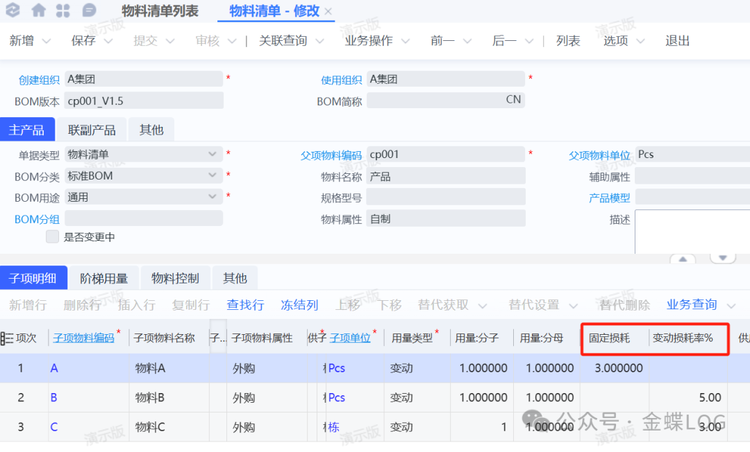 Q问题描述在物料清单(BOM)的精细化管理中,损耗率的设置直接关系到物料需求的准确性、成本核算的可靠性以及生产领料的合理性。BOM子项维护时,系统提供了固定损耗与变动损耗率两种方式,本文将深入解析其区别、计算逻辑及典型应用场景。学完本篇文章,您将学会:①【固定损耗】和【变动损耗】的区别。②【固定损耗】和【变动损耗】的公...
