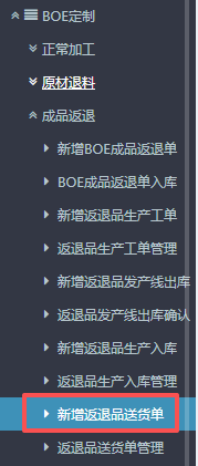 点晴ERP-BOE返退品送货单流程 1.进入ERP系统之后,在左侧的功能菜单里找到“BOE定制”,点开“成品返退”,点击“新增返退品送货单”。 2.进入界面后,按图操作:点击选择送货类型,然后选择对应客户。 3.接着到下方点击“物料编码”,会弹出物料信息窗口。 在弹出的物料信息窗口内,选择物料大类,点击查询...