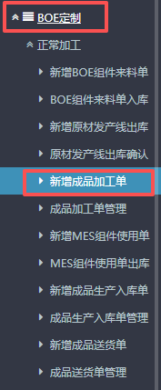 点晴ERP-BOE生产成品加工单流程 进入ERP系统之后,在左侧的功能菜单里找到“BOE定制”,点开“正常加工”,点击“新增成品加工单”。 2.进入界面后,按图操作:选择订单来源,备注有需要可补充。 3.接下来在下方找到“货品编码”点开,会有物料信息弹窗。 在弹窗的信息窗口内,按图操作:点击选择物料大类,点...