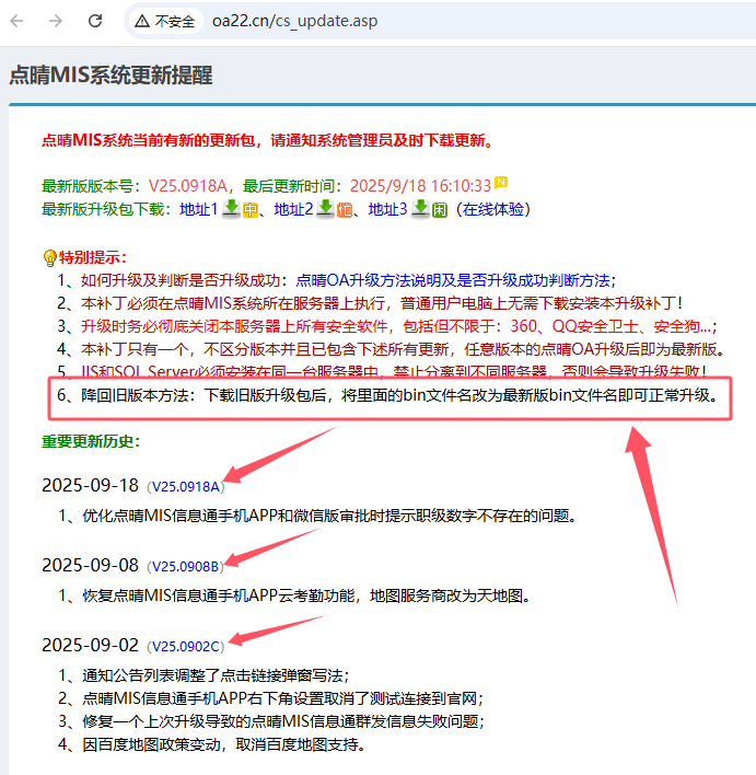 点晴OA升级下载地址(http://u.oa22.cn​)中,提供了最近几年的升级包下载地址,如下图: