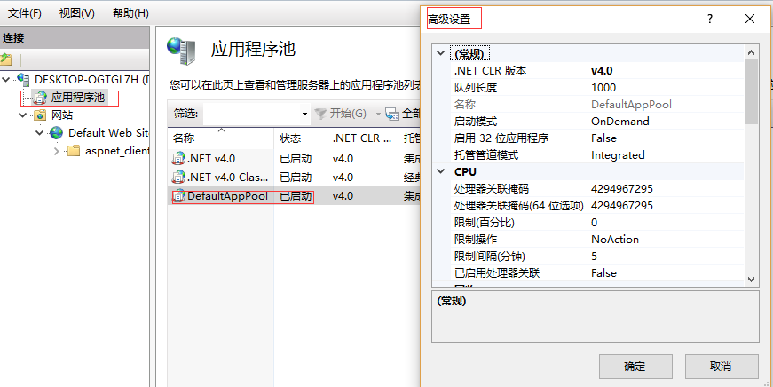 找到Web站点对应的应用程序池,“应用程序池” → 找到对应的“应用程序池” → 右键“高级设置...”